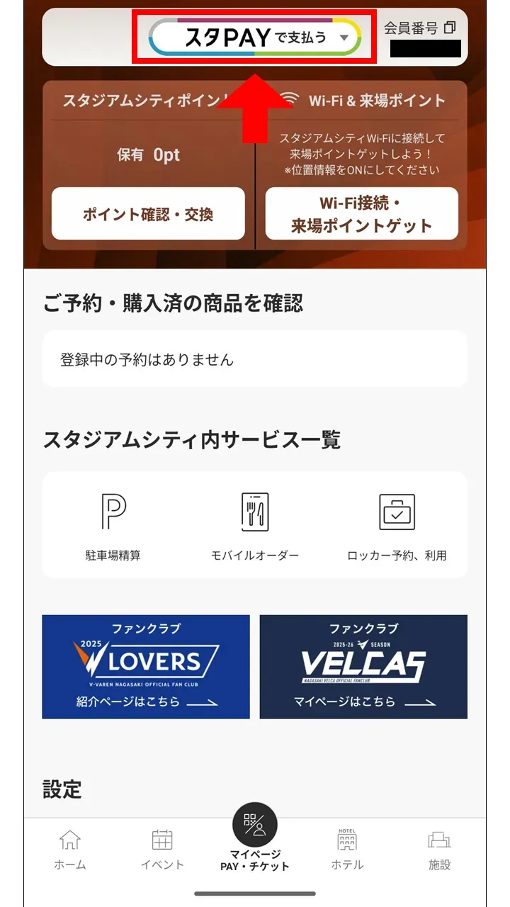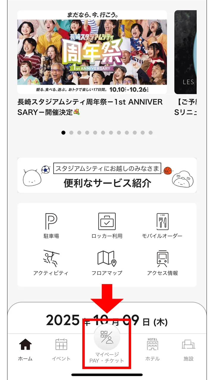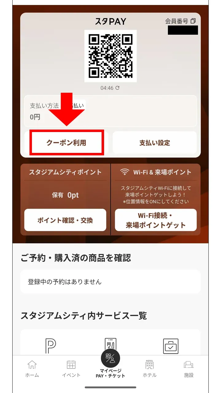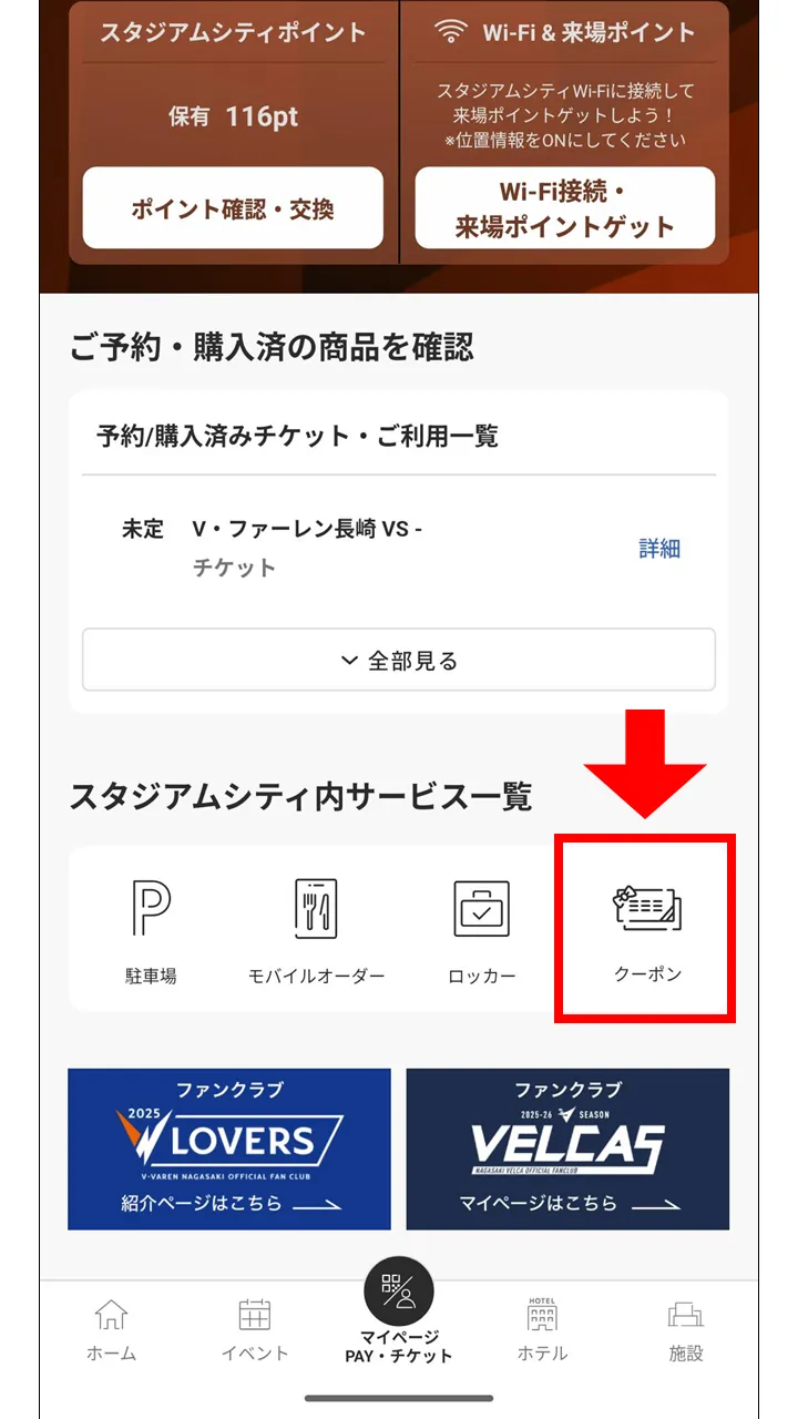スタジアムシティ内サービス一覧 にある「クーポン」を押す
