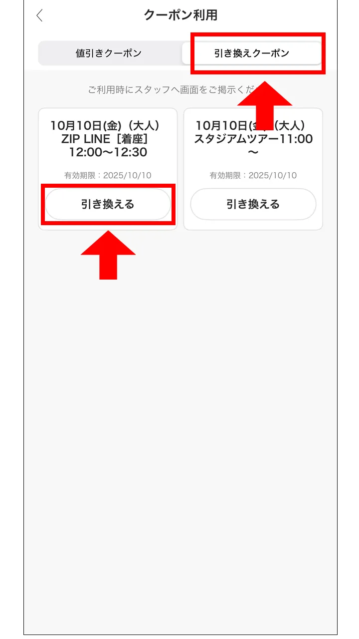 「引き換えクーポン」タブを押し「引き換える」ボタンを押す