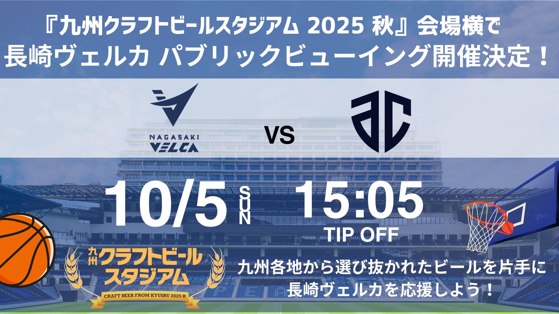 Public viewing of Nagasaki Velca vs. Artiri Chiba to be held next to the venue of "Kyushu Craft Beer Stadium 2025 Autumn"!