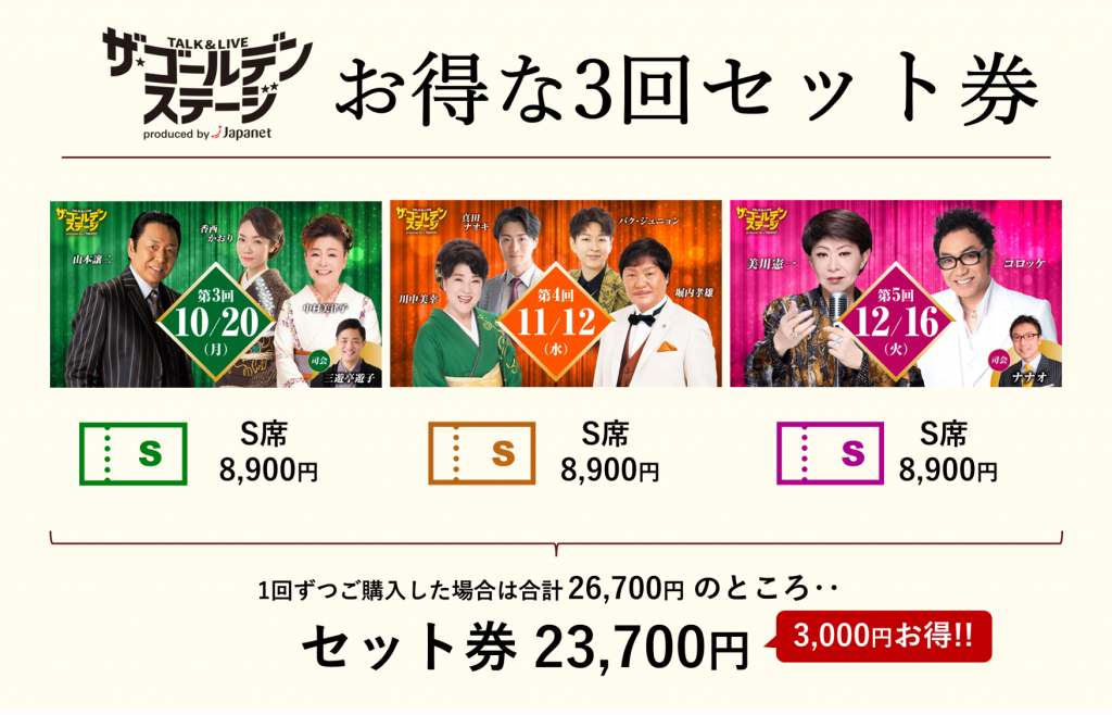 We are pleased to announce that we will be selling a "The Golden Stage 3-Event Set Ticket," which will allow you to purchase S-seat tickets at a discount for the 3rd (October), 4th (November), and 5th (December) events of "TALK&LIVE The Golden Stage produced by Japanet," which has been held every month since August!