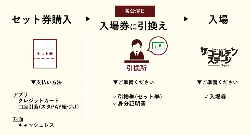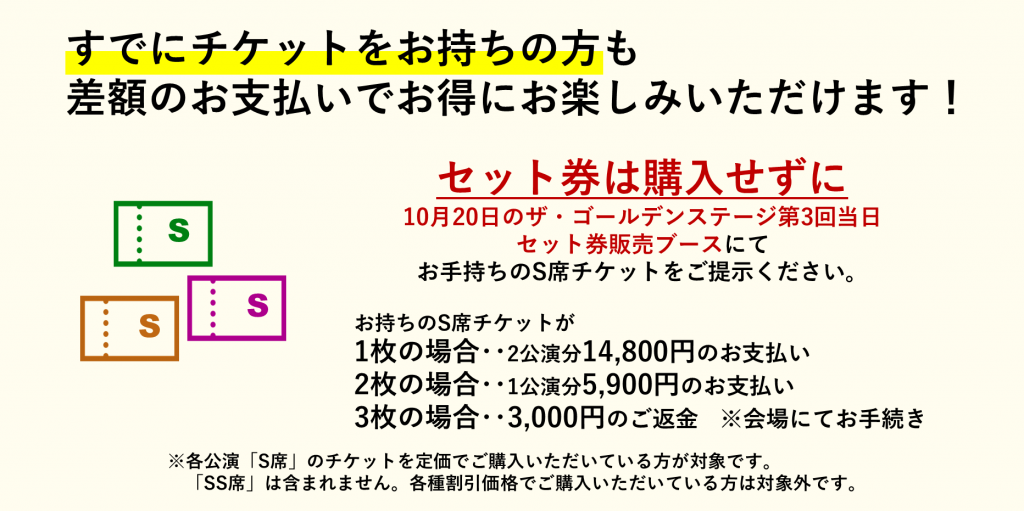 対象の方は、3回セット券は購入せずに、10月20日のザ・ゴールデンステージ第3回当日、会場入口付近のセット券販売ブースにてお手持ちのS席チケットをご提示ください。