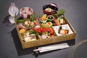 - 祝肴:紅白なます、黒豆、数の子松前漬、昆布巻、紅白蒲鉾、海老芝煮、伊達巻、鶏3色巻、松笠鮑、鰹胡桃、鮭若狭焼、花蓮根、多々喜牛蒡、筍土佐煮、捻り蒟蒻、大黒椎茸