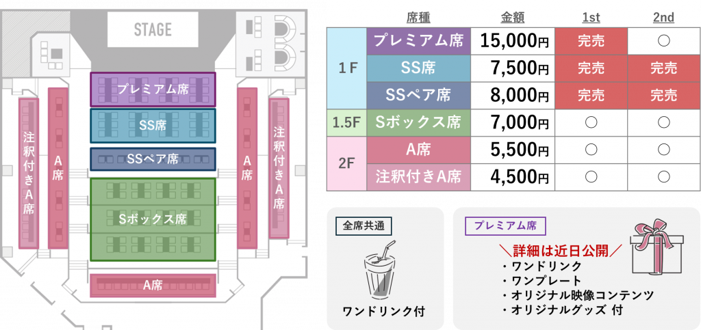 ・「S BOX席」を2枚でご購入の方、および「A席」を1枚でご購入の方は、他のお客様との相席でのご案内となります。