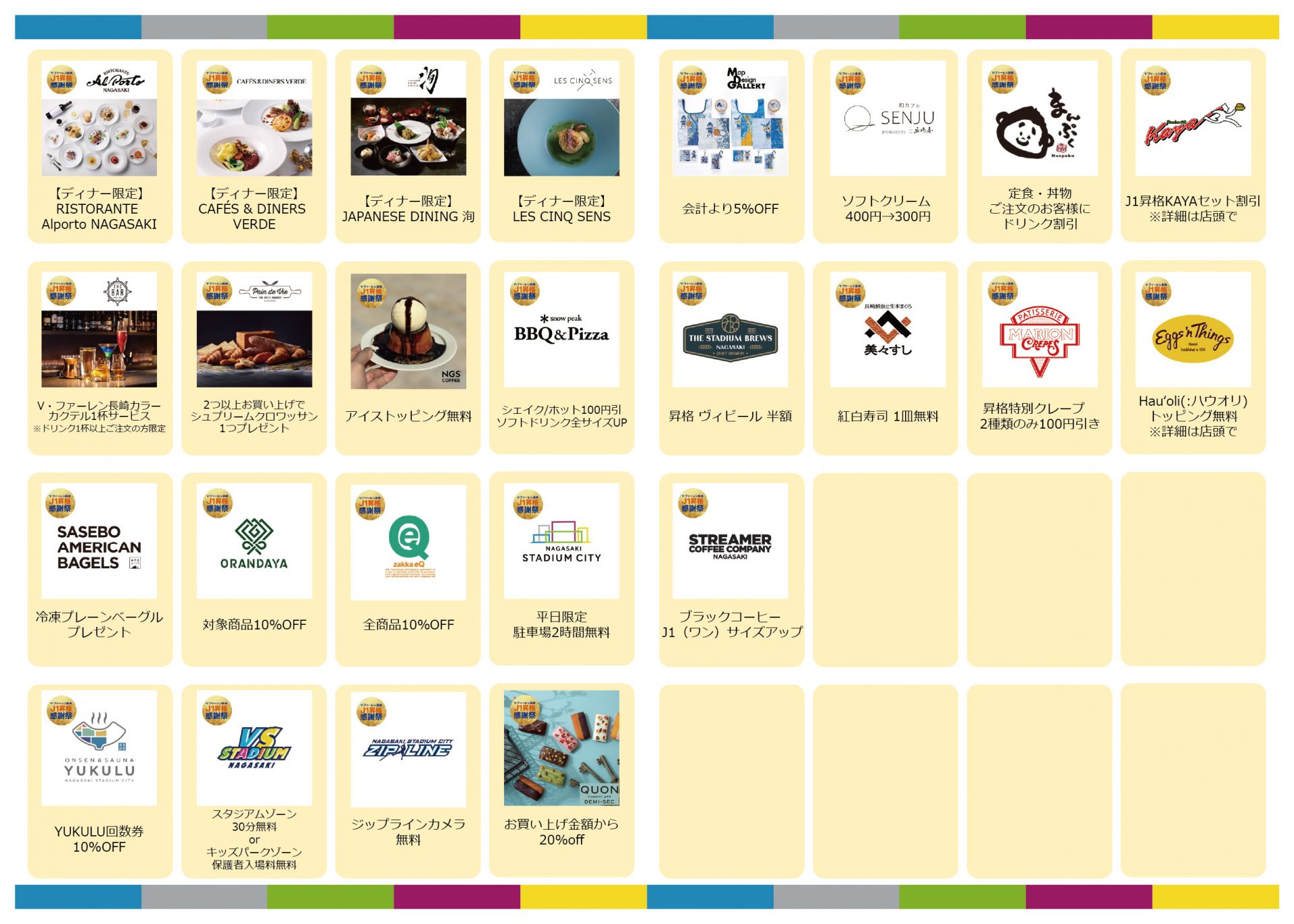 V・ファーレン長崎のJ1昇格を記念して、グルメやアクティビティ、リラクゼーション、ショッピングなど長崎スタジアムシティ内で楽しめるお得なクーポンを、長崎スタジアムシティ公式アプリ限定で配信いたします。