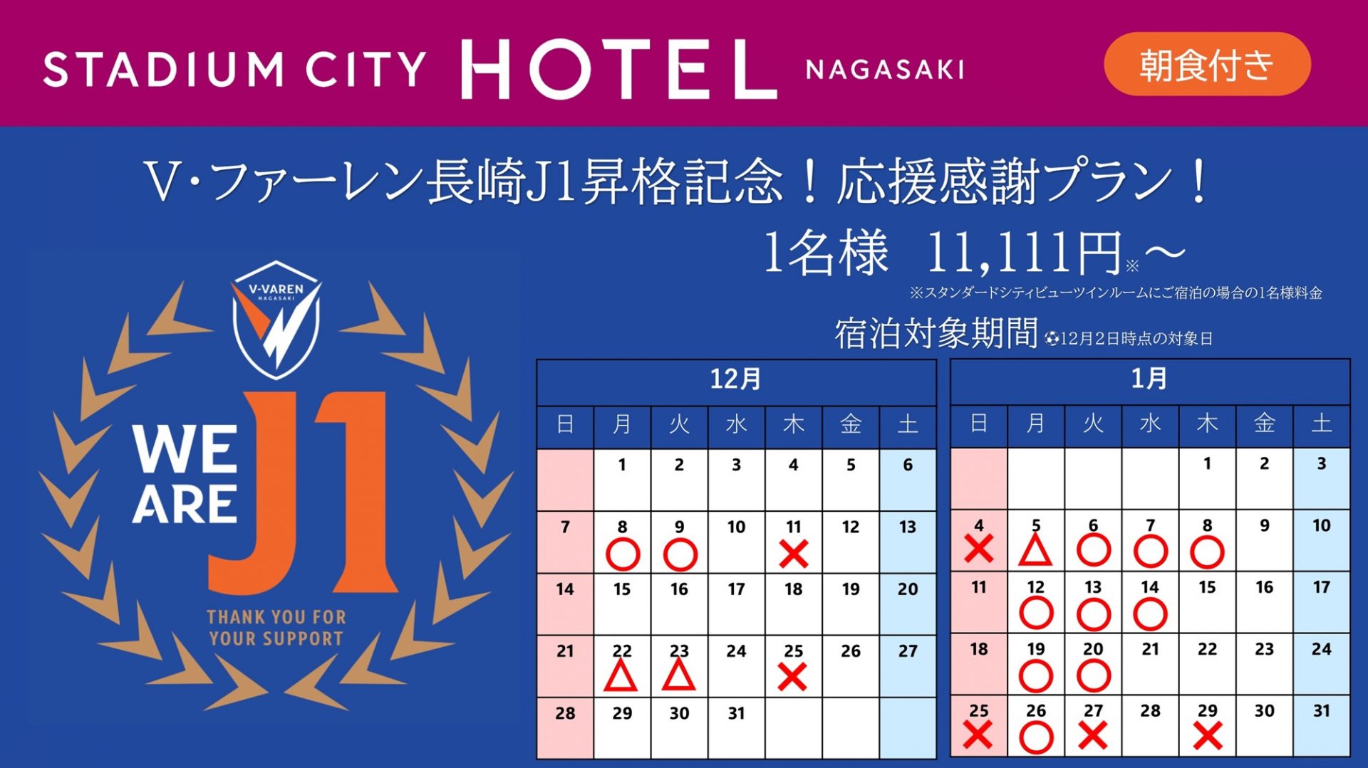 J1昇格の歓喜をかみしめながら、スタジアムシティホテル長崎で最高の思い出をお作りください!