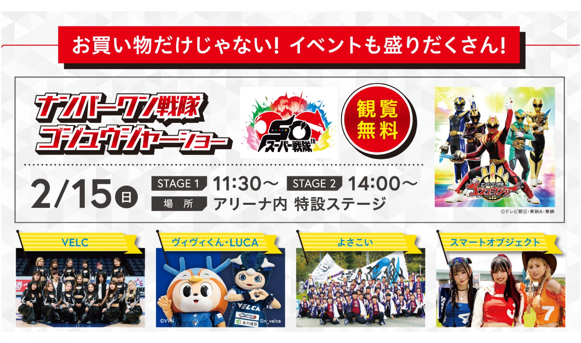 お子様に大人気の「ナンバーワン戦隊ゴジュウジャーショー」から、迫力満点の「よさこいコンテスト」まで、