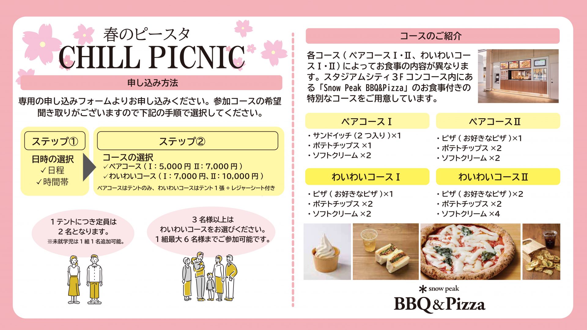 キャンプ初心者の方も大歓迎! スタジアムの開放感に包まれながら、スノーピークの機能美と「スノーピークBBQ&Pizza」自慢のグルメを心ゆくまでお楽しみください。