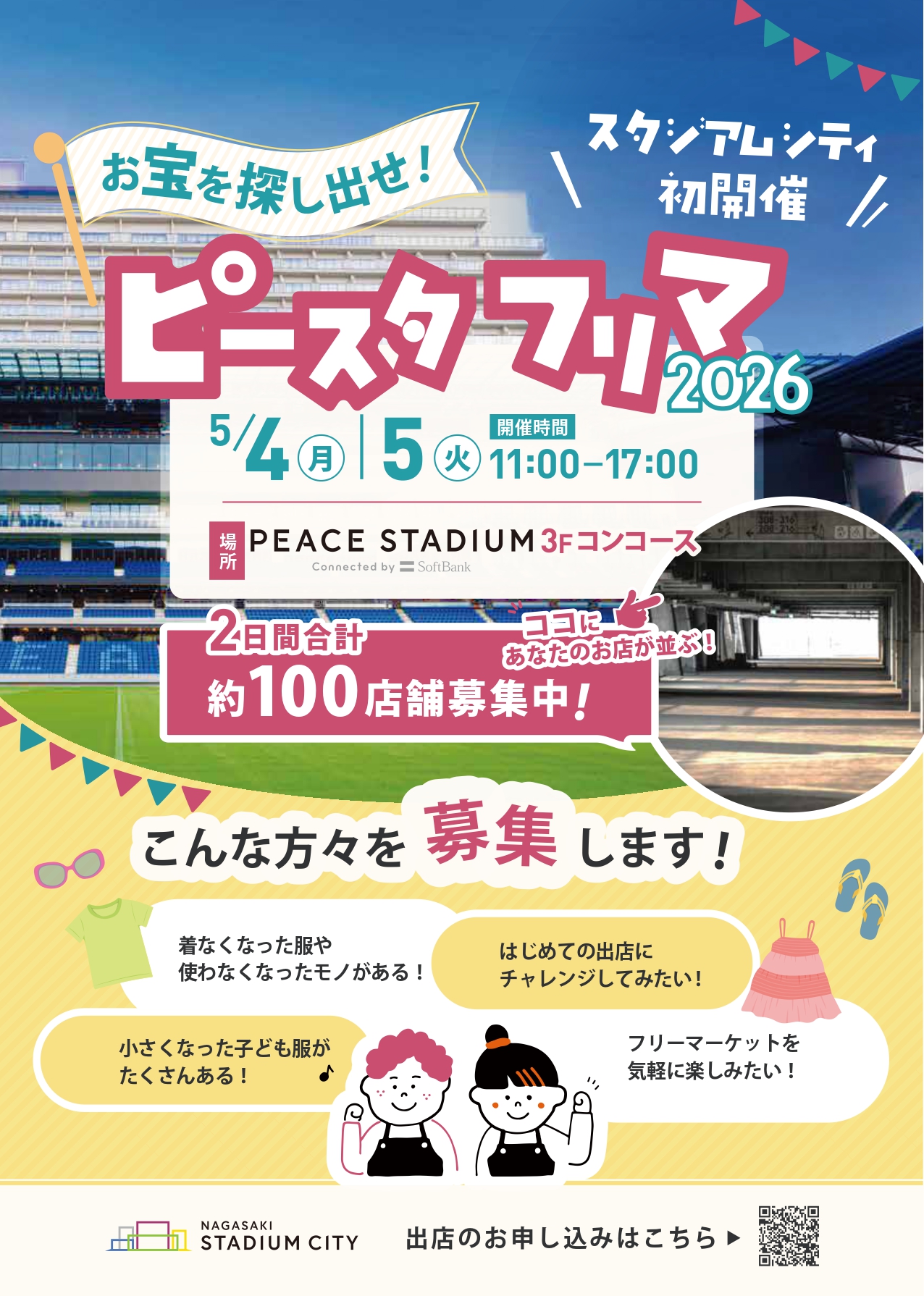 長崎スタジアムシティにて、親子で一日中楽しめるフリーマーケット「ピースタフリマ」を初開催いたします!衣類や雑貨、ハンドメイド品など、最大50店舗が並ぶ賑やかな2日間です。 ぜひお気軽にお越しください。