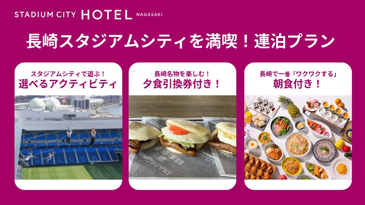 V・ファーレン長崎の試合日限定! サッカーの熱狂を間近に感じるスタジアムステイ。選べるアクティビティチケットやスタジアム内飲食店の夕食引換券がセットになった連泊プランです。長崎スタジアムシティでのご滞在を最大限にお楽しみください。