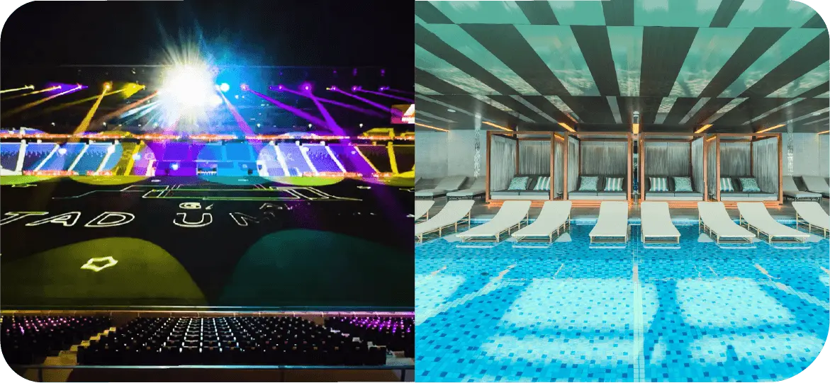 音と光に包まれるレーザーショーやスタジアムを望むプール
