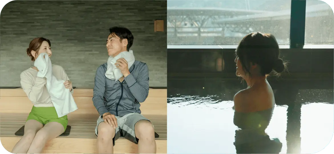 街並みも夜景も一望できる。スタジアムビューサウナや天然温泉