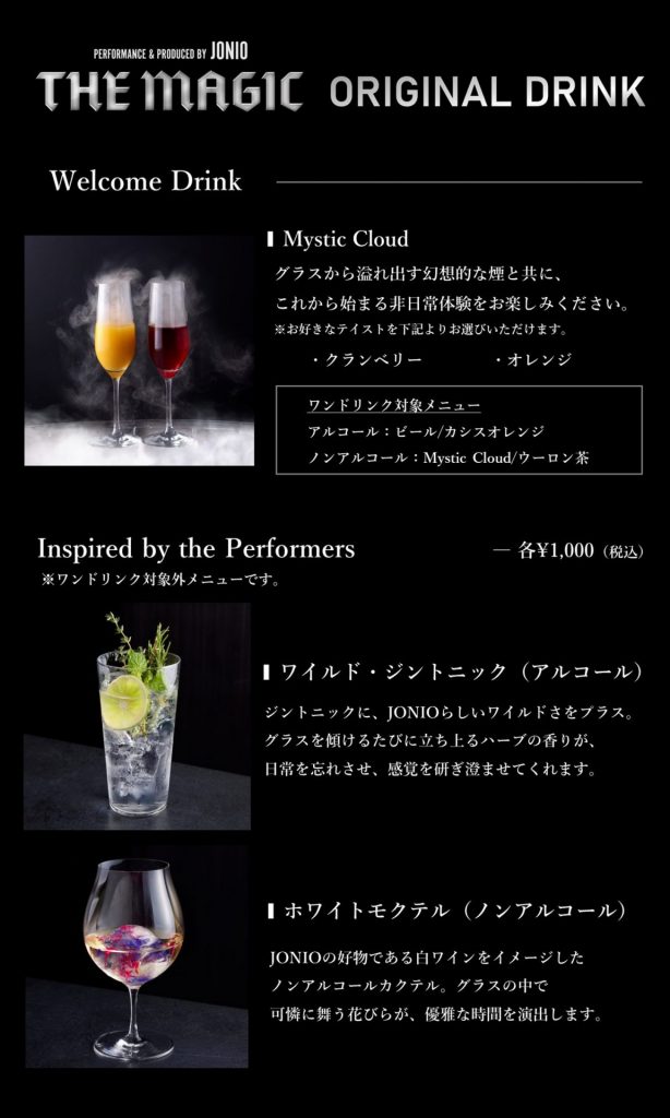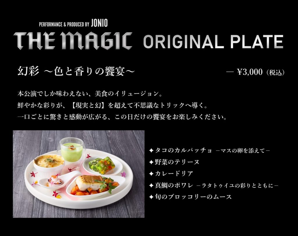 プレミアム席の限定特典として、ここでしか見ることができないJONIOからのショーの見どころ紹介動画と、簡単なマジック講座のプレゼントを予定しています。さらに、「THE MAGIC」オリジナルグッズや特製のワンプレートミールもお楽しみいただける盛りだくさんのお席となっています。