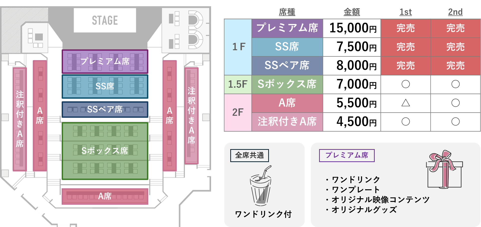 ・「S BOX席」を2枚でご購入の方、および「A席」を1枚でご購入の方は、他のお客様との相席でのご案内となります。