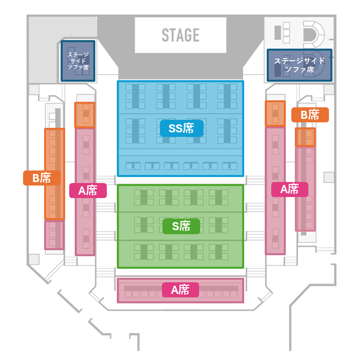 ・B席およびステージサイドソファ席は、ステージが見えにくい可能性がございます。