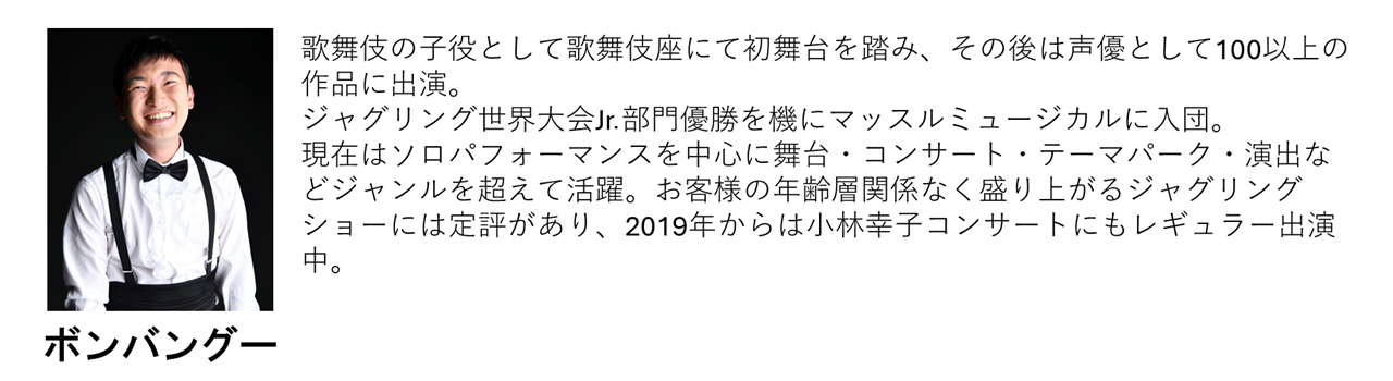 第1回公演で圧倒的なインパクトを残したSORAが再登場!独特な世界観で繰り広げられるマジックと、世代を超えて誰もが夢中になれるボンバングーの圧巻のジャグリングが一つのステージで融合し、新たな驚きを生み出します✨