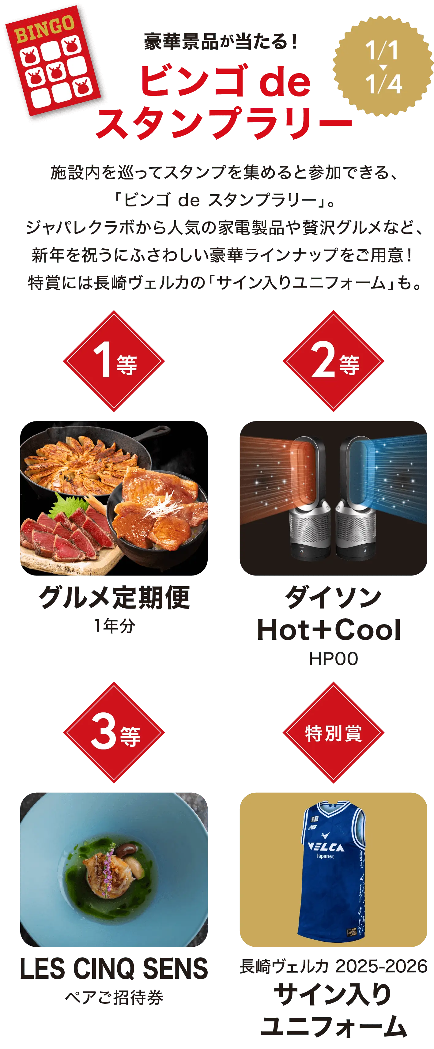 ※応募/抽選方法:施設内で配布するビンゴカードに記載の各条件を満たし、3列以上揃えたら1回抽選可能。商品写真はイメージです。商品の数量には限りがあり、当選された方への商品の引き渡しは先着順となっております。応募、抽選内容、景品は予告なく変更になる場合がございます。