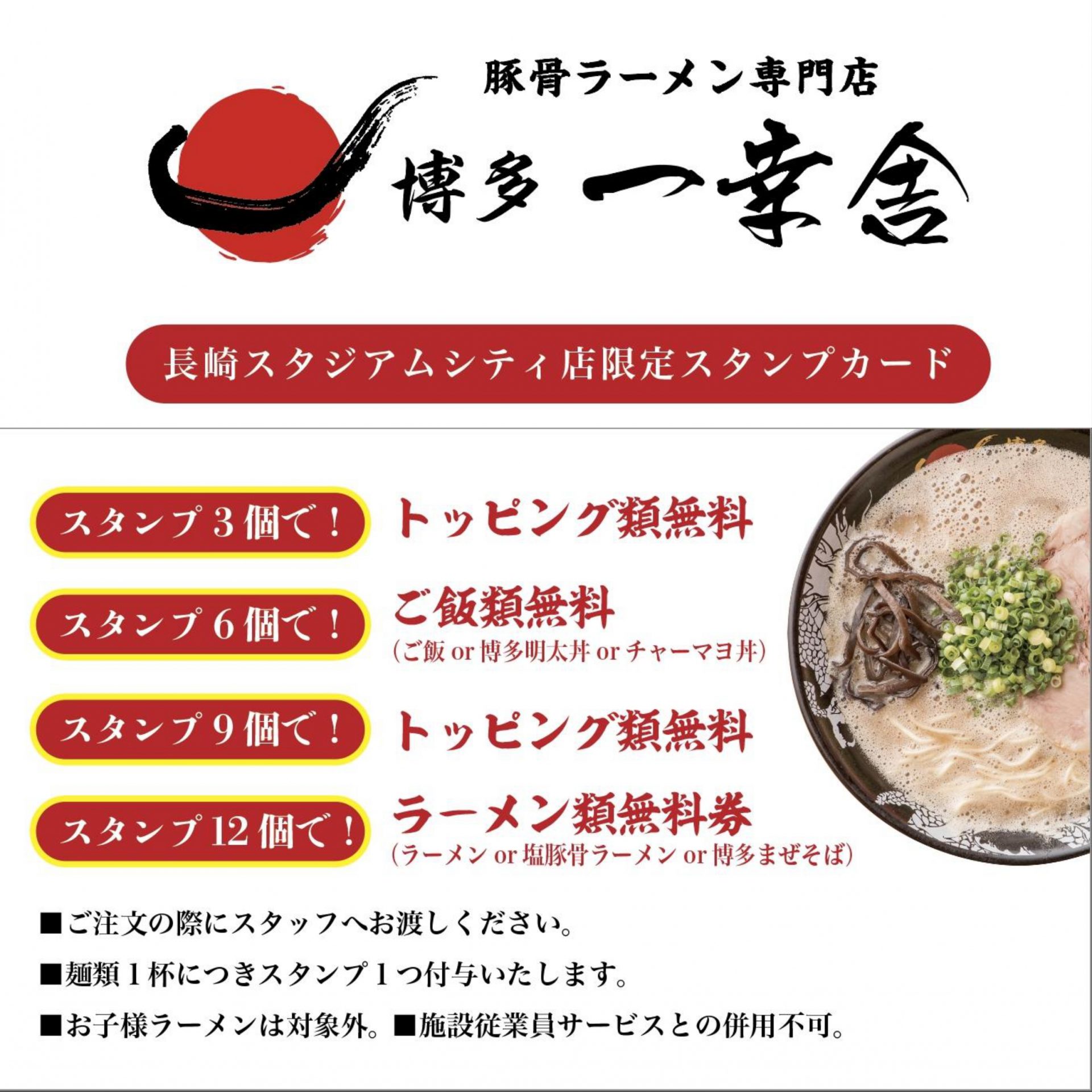 麺類1杯のご注文でスタンプ1つ付与。貯まるとトッピング無料などの特典が受けられる!