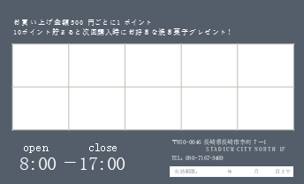 500円でスタンプ1つ付与。10個貯まると300円以下の洋菓子プレゼント!