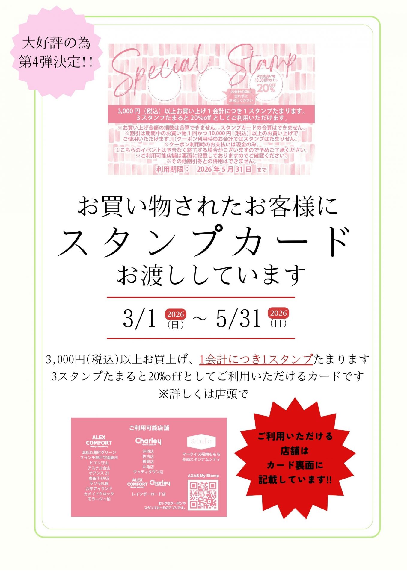 3000円以上のお買上げで1会計につき1スタンプ。3個貯まると、次回10,000円以上のお会計が20%OFF!