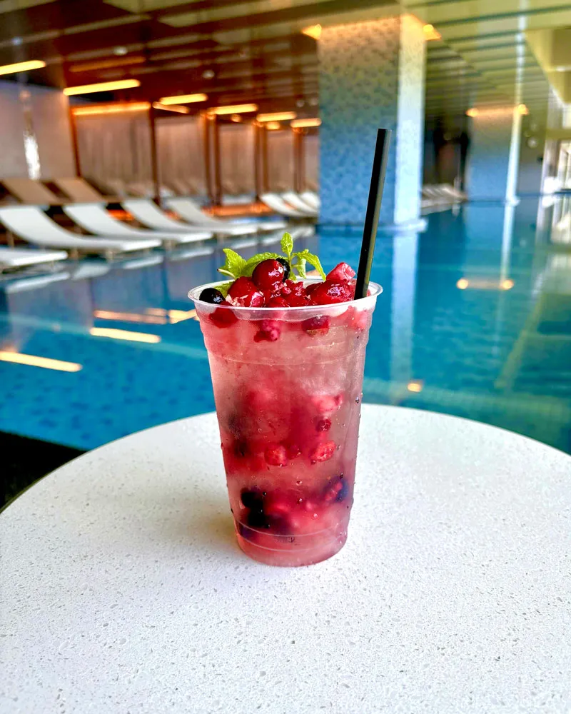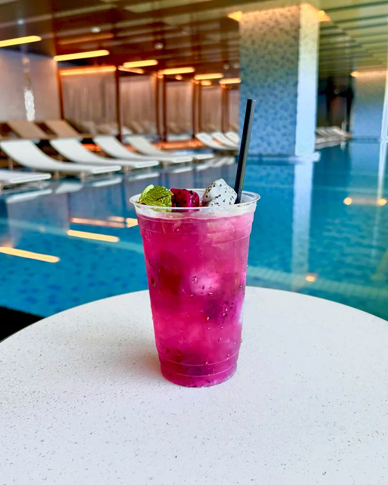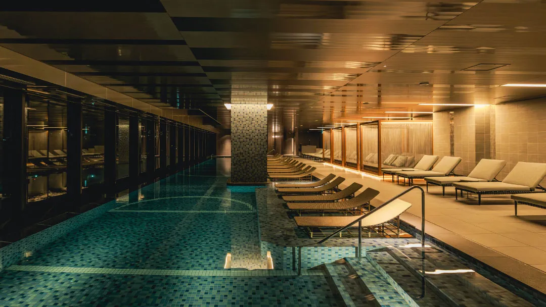 请一边欣赏室内泳池的绝景,一边享受优雅的片刻时光。